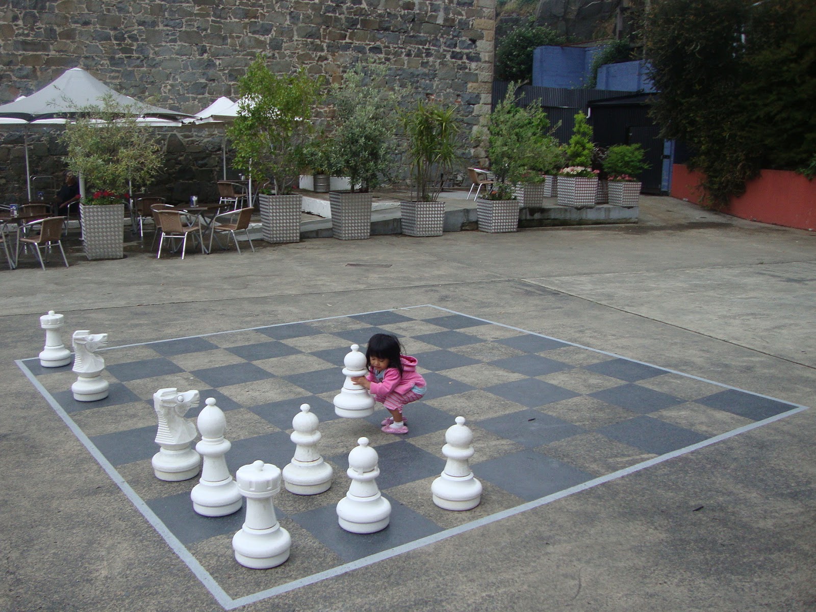 The washing finished quicker than we ate. So we drank more of our drinks and waited while our Mum place our clothes in the dryer. Once we finished we went outside to take some photos. It was still raining outside. We wore our rain jacket and followed Ayesha just in front of the cafe. Ayesha has just spotted a large chess board. It was like the same one in Sydney at Hyde Park. Ayesha started to place the black pawns anywhere on the chess board. Mum started to help Ayesha and put the chess pieces to their right square. I stood watching on the side and taking photos. Ayesha seems enjoying herself, dragging the pieces onto different squares on the chessboard. A few minutes later when Ayesha was tired and the pieces were neatly tidied, Mum went inside to check of the laundry. She came back outside telling us that it’s finished. We went inside the laundry to where the dryers were. Our one was in the bottom-left corner. After she loaded the clothes back into the bag, we set of to find a toilet.