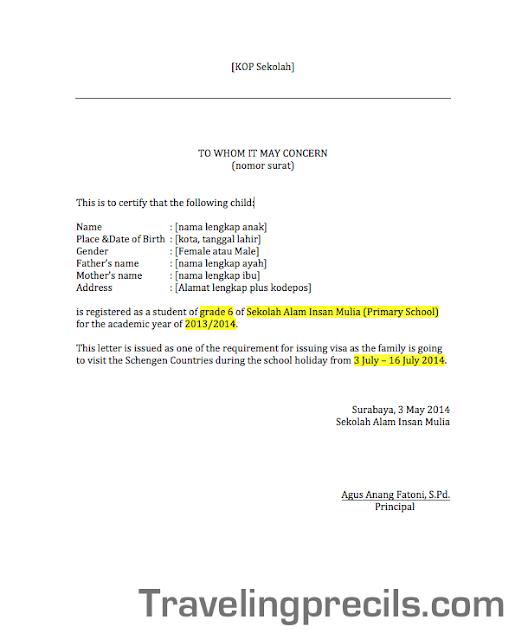 Ini contoh surat keterangan kerja, surat keterangan dari sekolah dan contoh itinerary sheet. Klik untuk memperbesar. Boleh diunduh, boleh dibagikan dengan mencantumkan tautan www.travelingprecils.com
