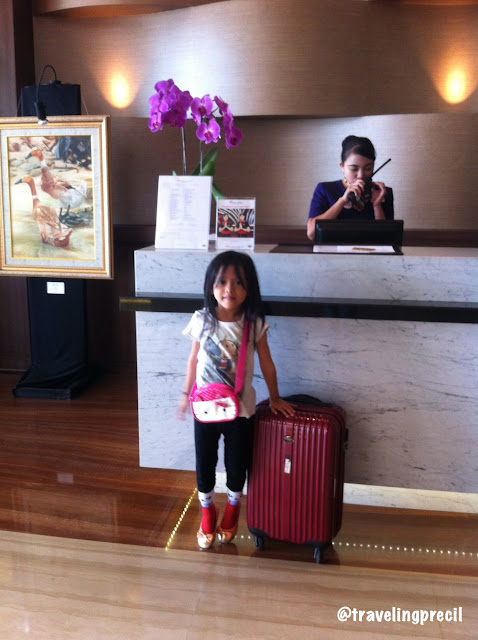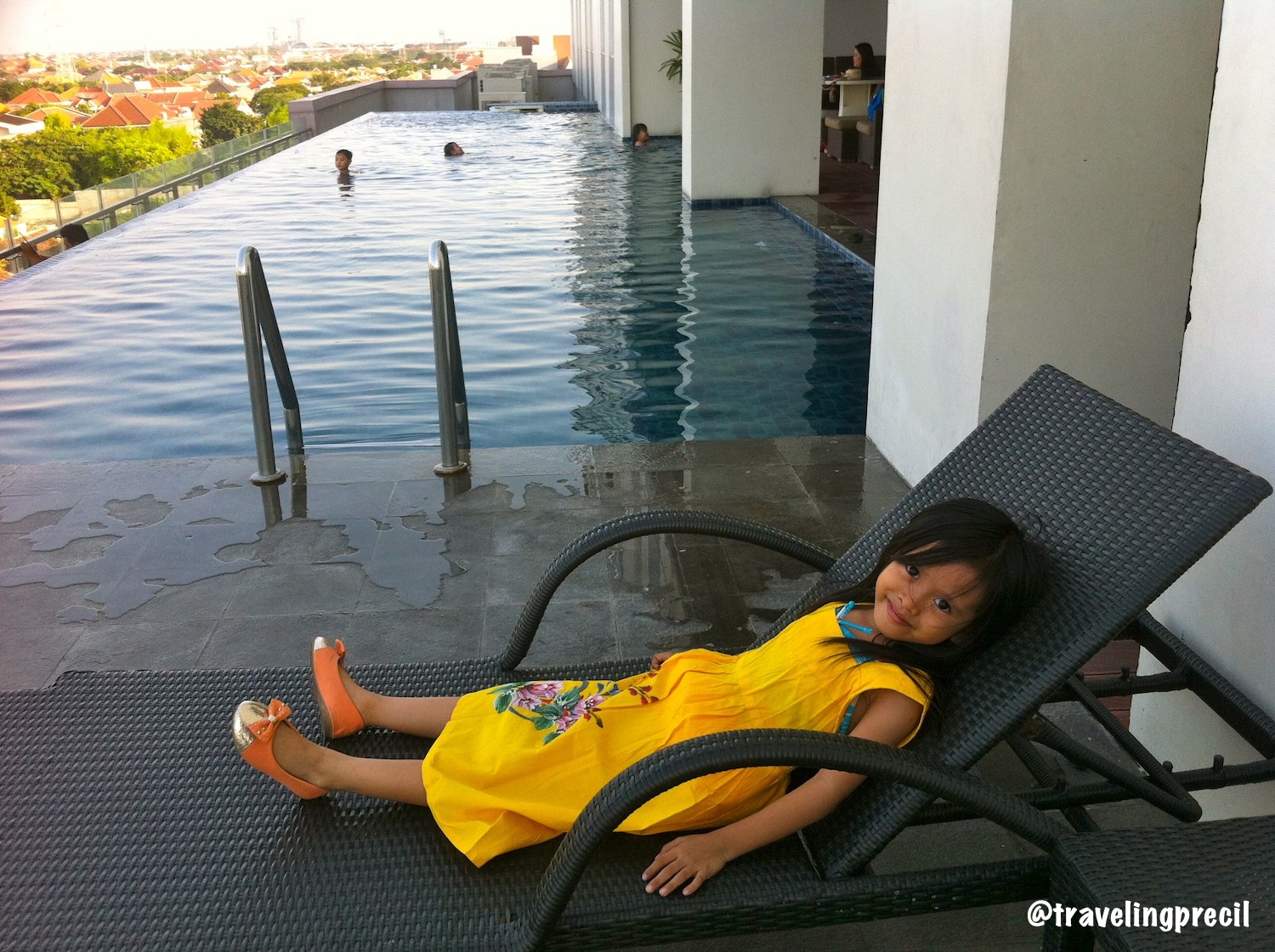 Kami naik taksi, dan nggak sampai setengah jam kemudian sudah sampai di hotel Swiss Belinn di Jalan Kertajaya (Manyar Kertoarjo). Little A seneng banget diajak nginep di hotel. Tidak lupa saya packing bikini Little A untuk berenang di sore hari. Untuk baju ganti Si Ayah dan Big A, saya ambil sembarangan saja karena terburu-buru. Mereka akan menyusul nanti sore sepulang kerja dan sekolah. Saya memberi tahu Si Ayah juga setelah mendapat kunci kamar. Biar dia pasrah manut saja, hahaha.