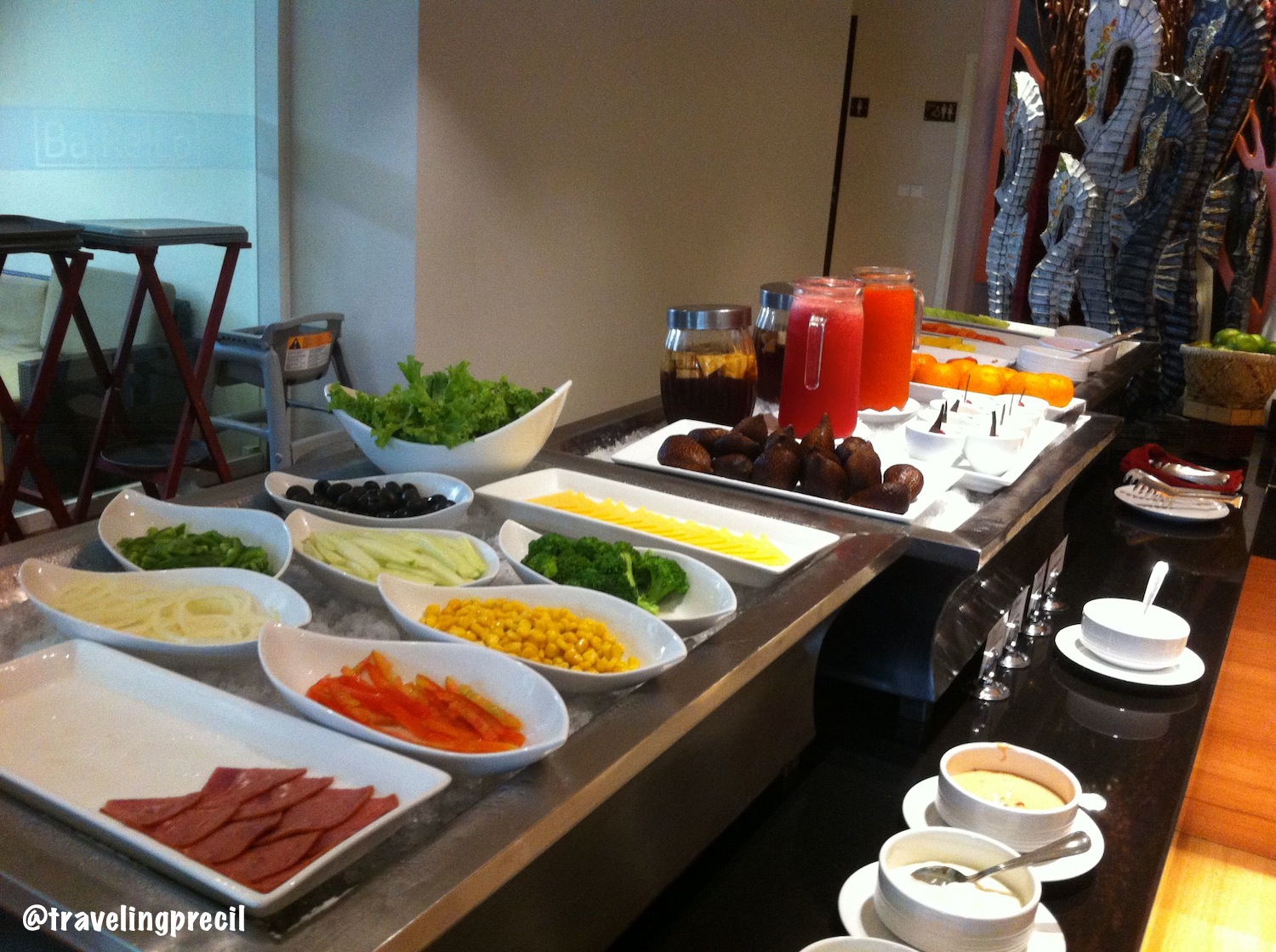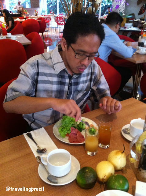 Bufet sarapan yang dihidangkan hotel cukup beragam, ala Barat dan ala Indonesia. Mulai dari roti, pastry, salad, nasi goreng, mie goreng, pecel, soto, tahu telor, sampai jajanan angkringan. Kami tentu pilih yang sehat-sehat dong. Si Ayah aja sarapan salad (ronde pertama sih, hehe). Duo lidah bule sarapan roti oles mentega. Sementara The Emak makan pecel, tanpa nasi!