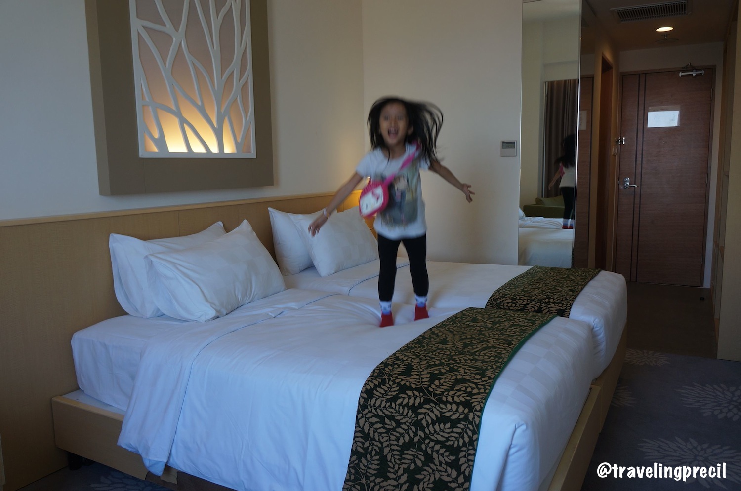 Kami mendapat kamar di lantai 11, paling tinggi. Lantai ini non-smoking floor, jadi tidak tercium asap rokok sama sekali. Alhamdulillah, kami alergi asap rokok je, bisa bengek nanti kalau ada asap sedikit saja. Kamarnya cukup luas, bersih, dengan dekorasi minimalis modern. Single bed-nya cukup lebar: 120 cm, jadi buat keluarga kami yang berukuran mini ini bisa cukup untuk berdua. Malah dua kasur didempetkan ini lebih nyaman buat kami berempat daripada berdesakan di satu kasur queen bed. Kasurnya King Koil, sudah jaminan mutu dan terasa sangat nyaman. Little A juga puas lompat-lompat di kasur 🙂