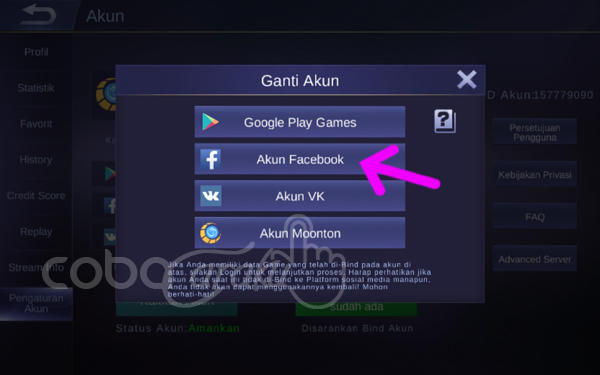 3. Silahkan pilih Google Play Games atau Facebook yang akan dikaitkan ke akun Mobile Legends. kalau dikaitkan keduanya juga boleh.
