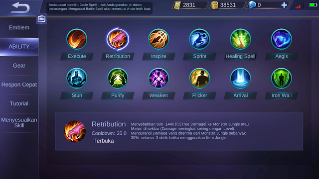 – Retribution = berguna untuk mempercepat melakukan farming sehingga cepat naik level dan mendapatkan banyak gold. Gunakan Retribution jika kamu mengisi mid lane.