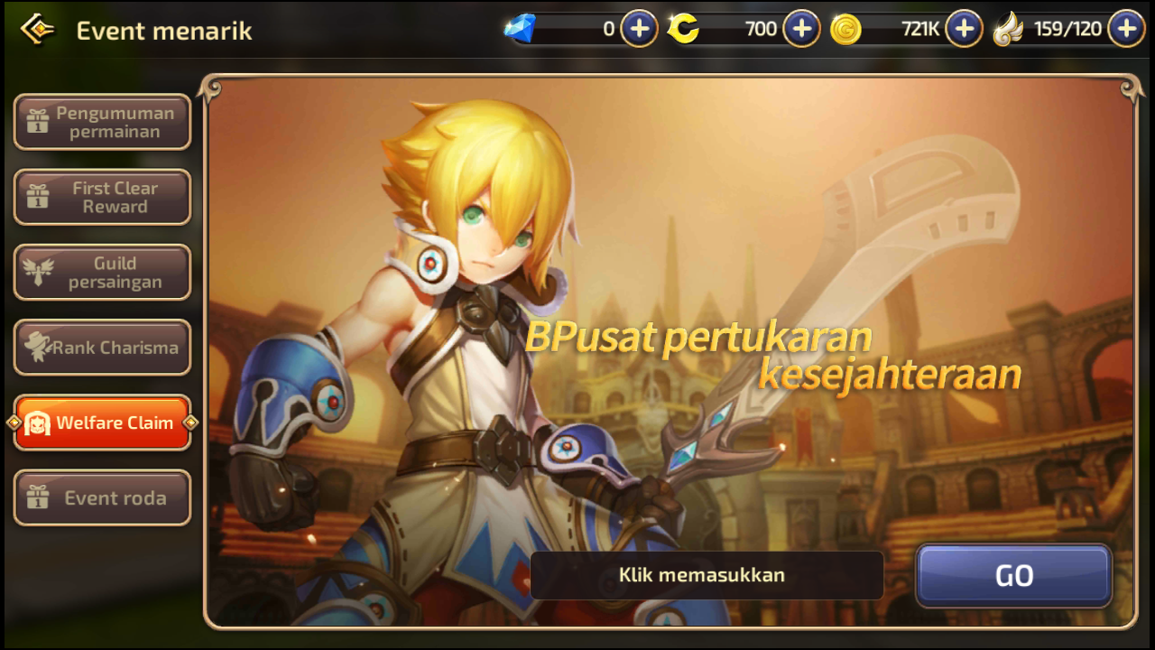 6. Setelah masuk ke game silahkan pilih menu Event» Walfare Claim.