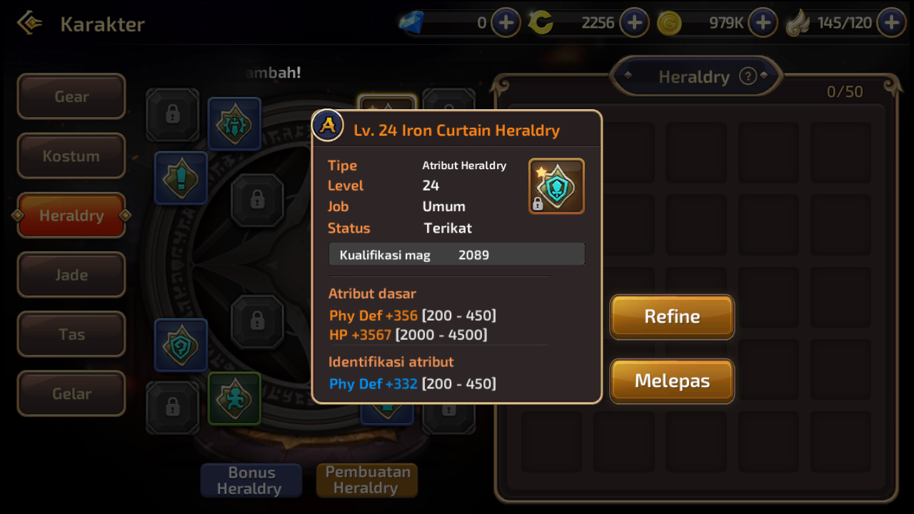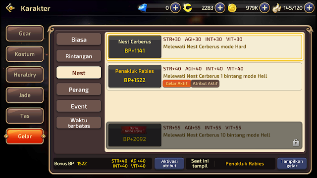 Pada level 25, kamu akan mendapat misi Bosrush yang memiliki reward kantong Heraldry. Terdapat grade C, B, dan A Heraldry disetiap reward. Heraldry berfungsi untuk menambahkan atribut karakter kamu, sehingga akan sangat berpengaruh untuk meningkatkan BP.