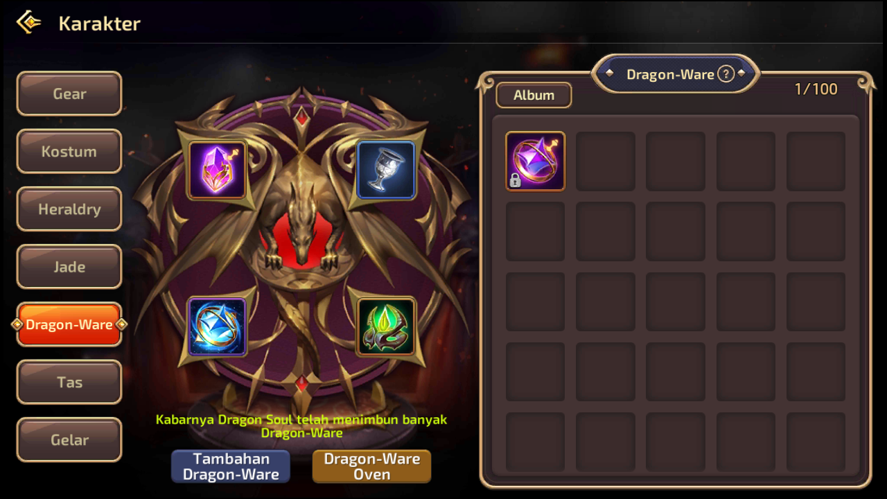 Saat level karakter kamu mencapai 35, akan terbuka fitur Gear Dragon Ware. Terdapat 4 jenis Gear ini yang bisa kamu gunakan. Kamu bisa mendapatkan Gear ini dari misi harian Dragon Soul. Untuk masuk ke Dragon Soul dibutuhkan tiket yang bisa kamu beli ditoko koin naga. Terdapat grade B, A, dan S yang bisa kamu dapatkan, atau lebih beruntung lagi kamu akan mendapatkan drop yang lebih bagus lagi.