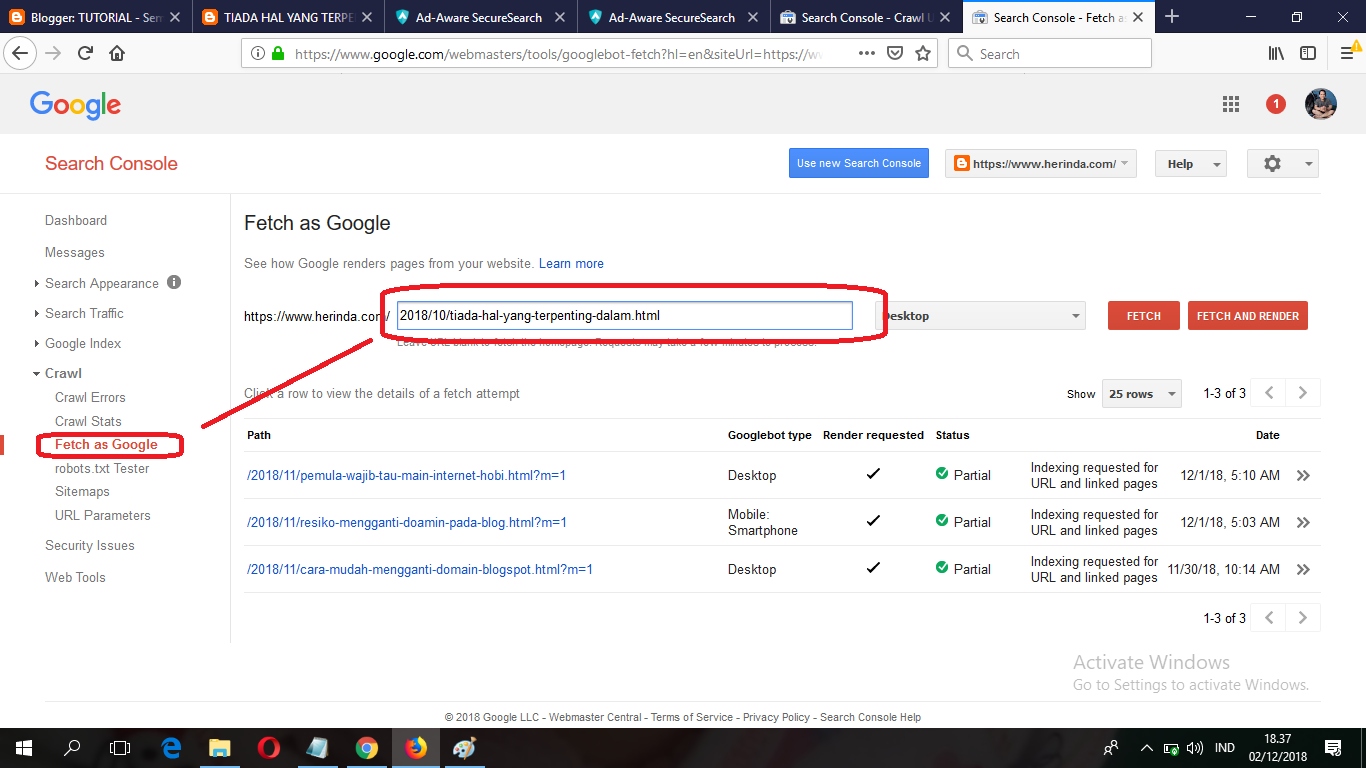 saat menu crawl di klik makan akan muncul tampilan kolom untuk submit link artikel kalian,copy pastekan saja link halaman yang akan kalian add url to google index.misal link nya https://www.herinda.com/2018/11/cara-mudah-mengganti-domain-blogspot.html,cukup ketikan url halamannya saja contoh  2018/11/cara-mudah-mengganti-domain-blogspot.html,untuk domainnya  https://www.herinda.com/ hapus saja