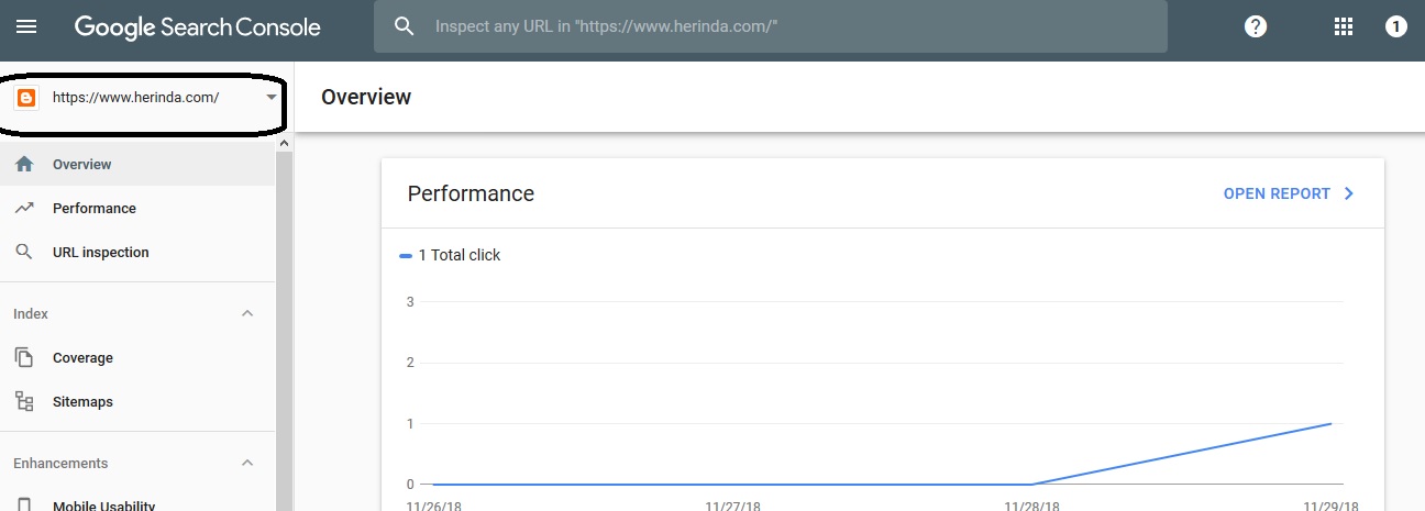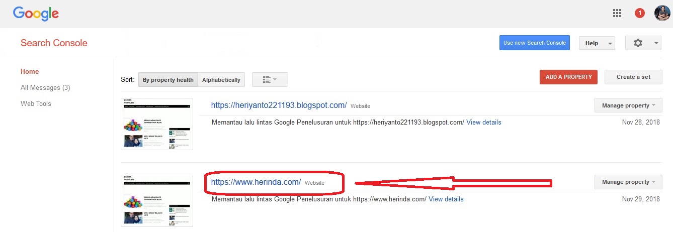 4.maka akan muncul properti situs yang sebelumnya kalian masukan di Google Webmaster Tools