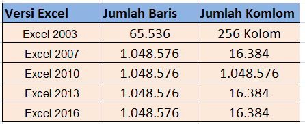 Untuk lebih jelah anda dapat melihat tabel dibawah ini jumlah baris dan kolom sesuai dengan versi Microsoft Excelnya.