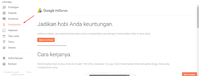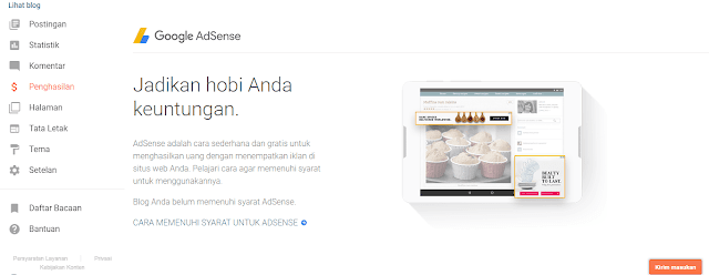 Jika tidak nampak, klik Setelan > Bahasa & Pemformatan. Ubah bahasa dari Indonesia ke Inggris (Inggris Raya). Simpan Setelan kemudian Refresh halaman. Maka akan muncul menu Penghasilan, kemudian klik. Jika blog/website sudah memenuhi syarat maka akan muncul tombol pendaftaran untuk AdSense, tapi jika belum, akan muncul pesan bahwa blog/website belum memenuhi syarat untuk didaftarkan di AdSense.