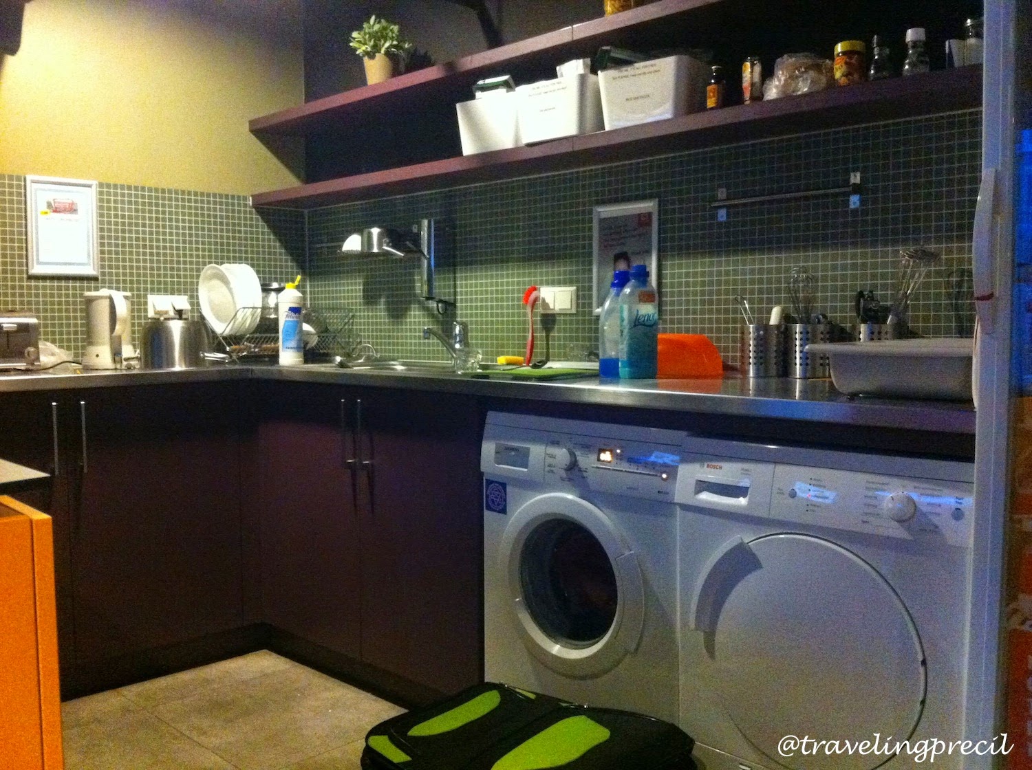 Di malam kedua, kami menggunakan fasilitas dapur untuk memanggang sosis yang kami beli di Cologne, Jerman. Makannya tetap dengan nasi dan sambal. Fasilitas lain yang saya gunakan adalah mesin cuci. Karena packing light, kami perlu mencuci baju di perjalanan. Selama dua minggu EuroTrip, saya mencuci baju dua kali: di Meininger Amsterdam dan di apartemen Paris. Sebenarnya di Meininger ini ada fasilitas mesin pengering. Tapi sayangnya sedang rusak ketika kami menginap di sana. Terpaksa baju-baju kami gantung di kamar mandi dan beberapa yang susah kering kami keringkan dengan hair dryer. Fyuh!