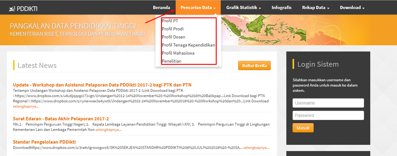 2. Pada Header Lihat Menu Pencarian Data Klik maka akan Muncul Pilihan, Profil PT, Profil Prodi, Profil Dosen, Profil Tenaga Kependidikan,Profil Mahasiswa , dan Penelitian, karna yang akan kita cek adalah profil mahasiswa maka klik pada Profil Mahasiswa