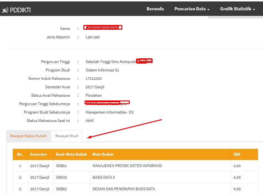 5. Kemudian selanjutnya akan tampil tabel sesuai dengan kata kunci yang kamu cari, selanjutnya untuk melihat data secara detail klik pada nama, maka akan tampil riwat pendidikanmu.