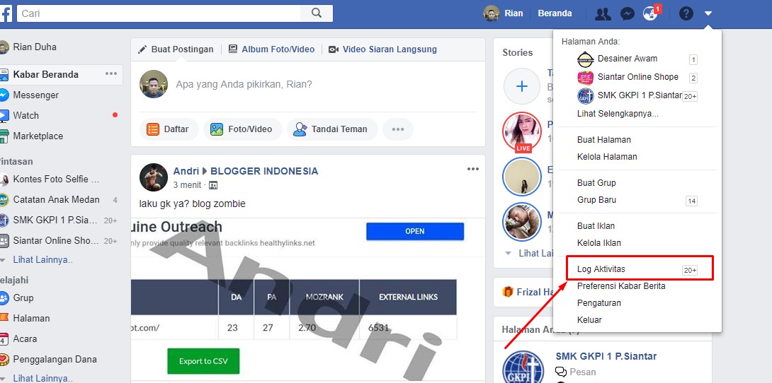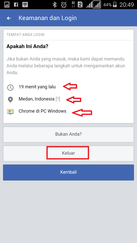 Untuk mengeluarkan caranya cukup mudah yaitu klik pada Keluar. maka akan otomatis FB anda telah Logout dari Perangkat tersebut.