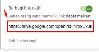 setelah berhasil mengupload file selanjutnya adalah mendapatkan link yang nantinya kita tautkan pada postingan, cara cukup mudah, klik kanan pada file yang sudah di upload kemudian” Dapatkan link yang dapat dibagikan” kemudian akan muncul “Berbagi Link Aktif” untuk lebih jelas perhatikan