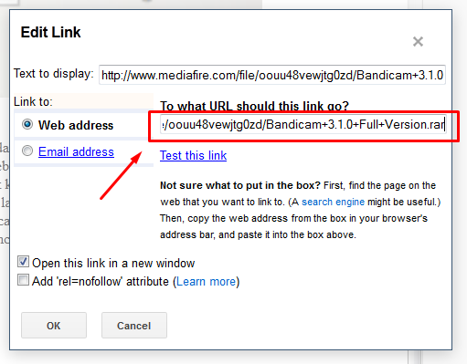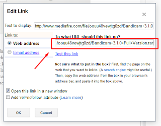 Setelah menyelesaikan tahapan mendaftar akun ke penyimpanan online dan upload file selanjutnya adalah membuat postingan terkai apa yang anda tawarkan untuk didownload kepada pengunjung. saya contohkan pada postingan blog saya yaitu “Download Bandicam Full Version – Aplikasi screen recorder”, perhatikan pada postingan yang saya buat pada gambar dibawah ini.