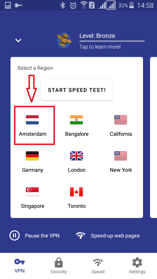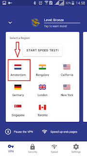 3. Select Lokasi, tinggal scrol keatas pada tampilan menu VPN pilih salah satu Nega, disini saya memilih Amsterdam
