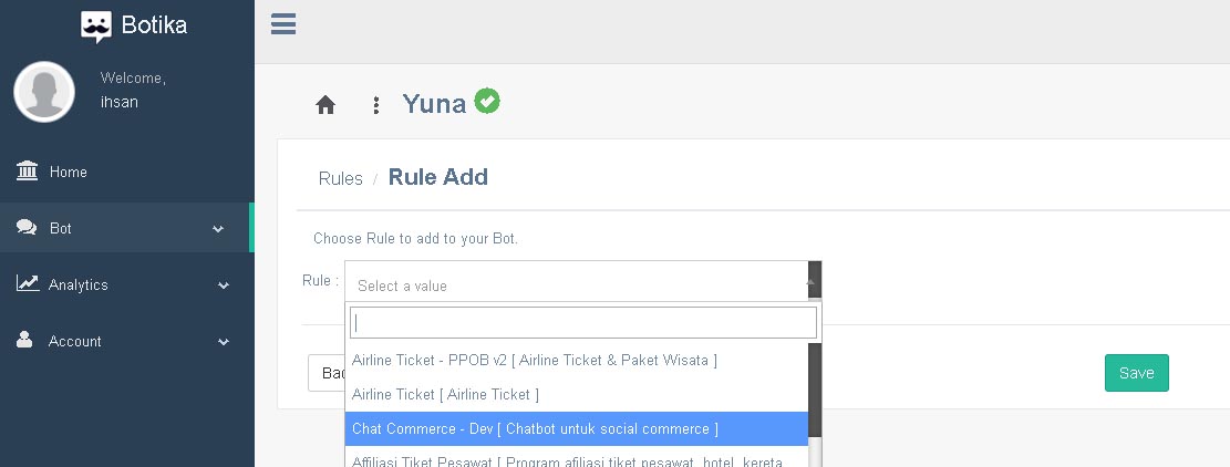 Lalu select value dari rules anda, contoh disini saya memilih “Chat Commerce” dan “Save”