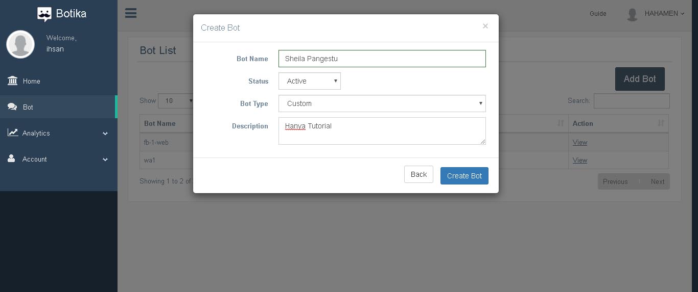Pilih Menu Bot disamping Kiri, lalu Pilih “Add Bot”