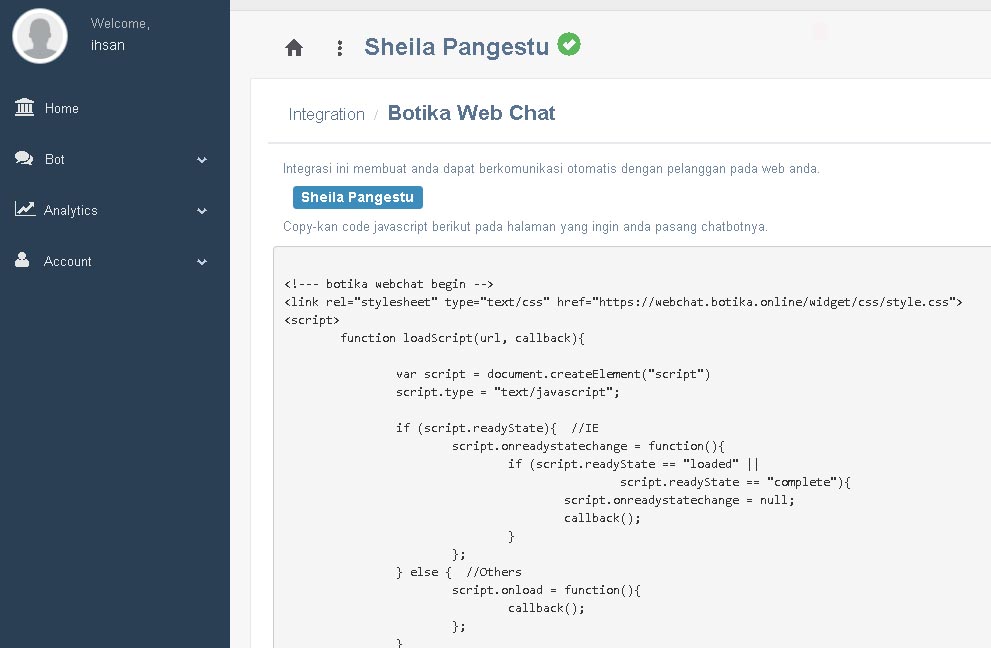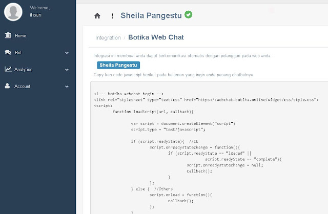 Disini kita bisa mengintegrasikan ke dalam banyak platform seperti Facebook Messenger, Line, Telegram, Whatsapp, Twitter, Web Chat, dan IG Comment, akan tetapi yang akan saya coba disini adalah Fitur “Web Chat” maka dari itu kita pilih tombol “Web Chat”, lalu akan muncul tampilan seperti ini :