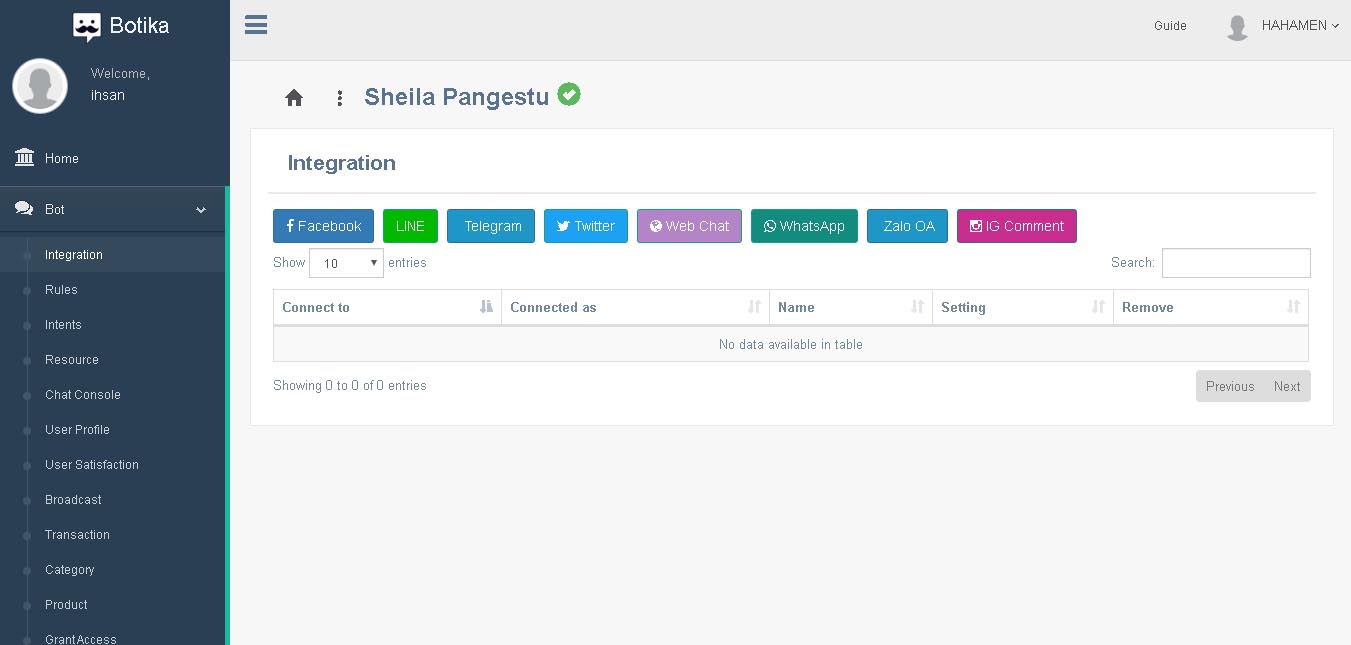 Dari Halaman Awal Pilih Bot yang ingin anda check (contoh disini saya pilih yang sudah saya buat sebelumnya dengan klik “View”) anda akan dibawa menuju menu integration terlebih dahulu, baru kemudian Pilih ke Menu “Bot” Lagi, Kemudian Pilih “Chat Console”