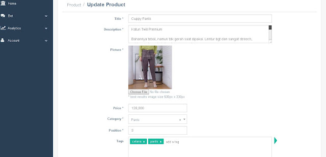 • Tags: jika perlu, Anda bisa menulis tak (kata kunci) yang berhubungan erat dengan produk tersebut. Sebagai contoh, produk sabun pencuci wajah memiliki kata kunci: wajah, facial, kecantikan, foam, jerawat, dan seterusnya.