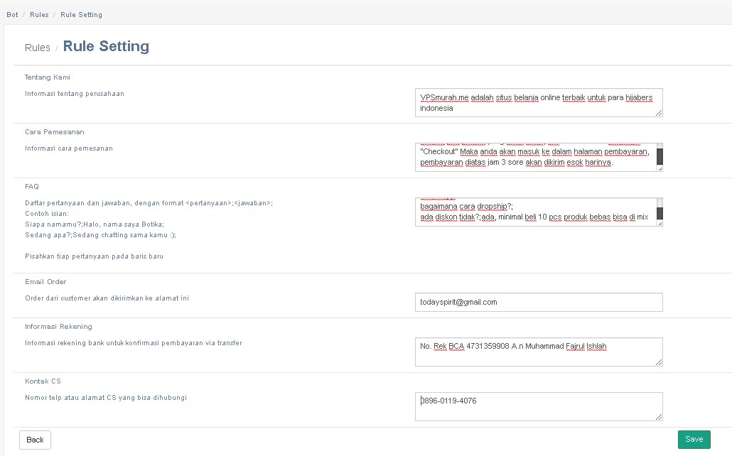 Ada beberapa isian yang perlu diatur terlebih dulu agar rule ini dapat bekerja dengan baik ketika calon buyer melakukan percakapan, yaitu: