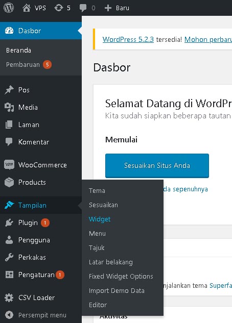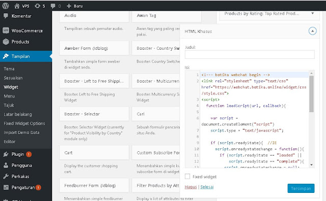 Copy-kan semua kode ini di halaman yang ingin anda pasang chatbotnya, dan disini saya akan taruh di bagian widget dari wordpress dengan cara pilih menu tampilan -> widget