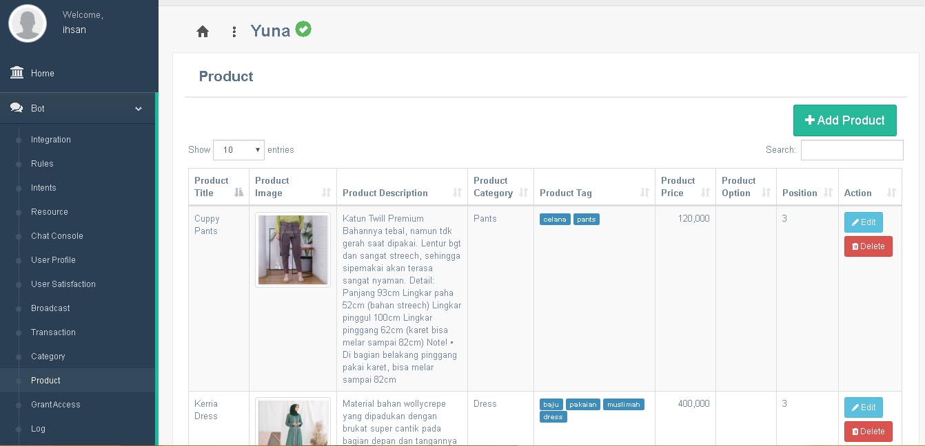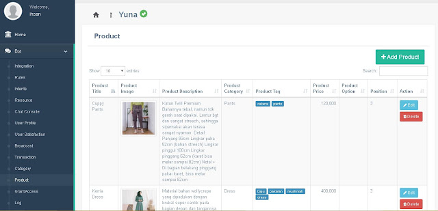 ini adalah tampilan dashboard chatting yang diterima oleh chatbot “fb-1-web” mari kita pilih menu grid dan pilih “Daftar Asisten” untuk mengakses semua chatbot yang telah kita buat (disini saya ambil contoh “Yuna”)