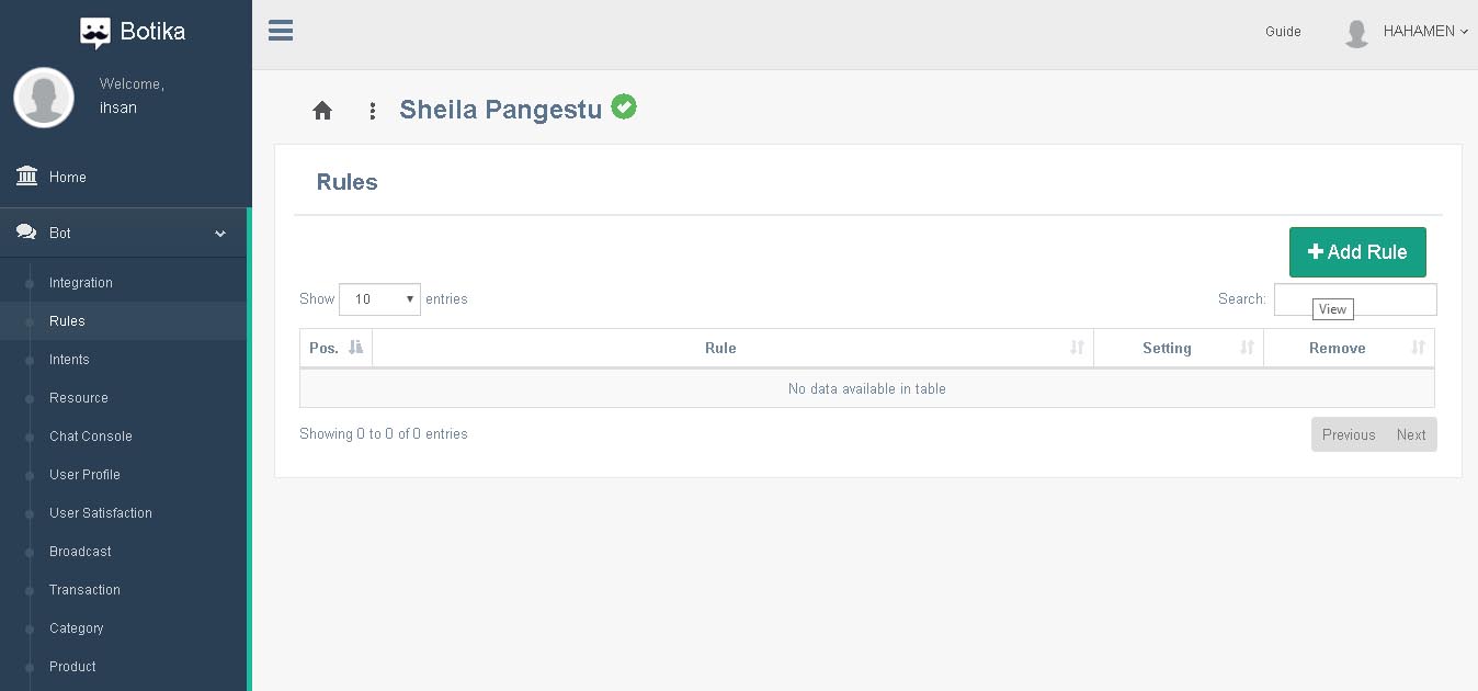 Sekarang kembali dashboard botika, pilih bot -> view -> rules -> add rules
