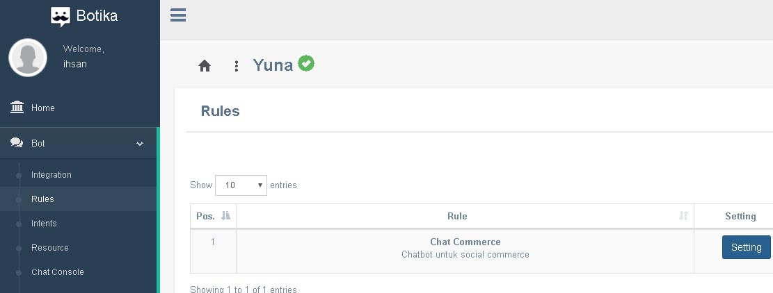 Oke, disini kita sudah memiliki rules “Chat Commerce” agar berjalan lebih baik, kita akan Setting Rules Live Chat, Tekan tombol Setting yang ada di sebelah kanan baris Chat Commerce.
