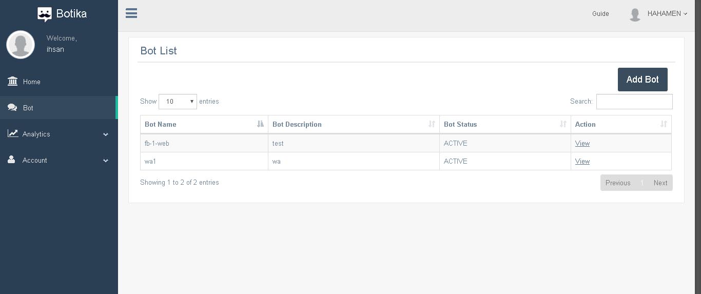 Tidak sampai 30 detik proses akan selesai, setelah itu pilih “View” dalam kolom “Action” di dalam row dengan nama bot yang tadi kita buat untuk setting lebih dalam.